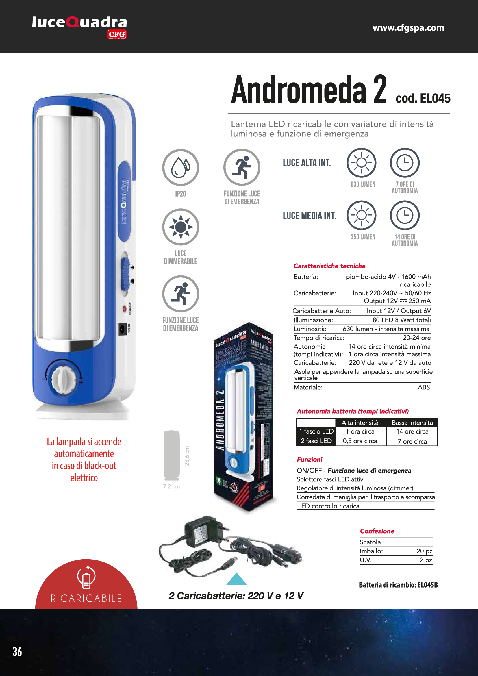 - Dotazioni: regolatore di intensità luminosa (dimmer), maniglia per il trasporto a scomparsa, LED controllo ricarica, asole per appendere la lampada su una superficie verticale